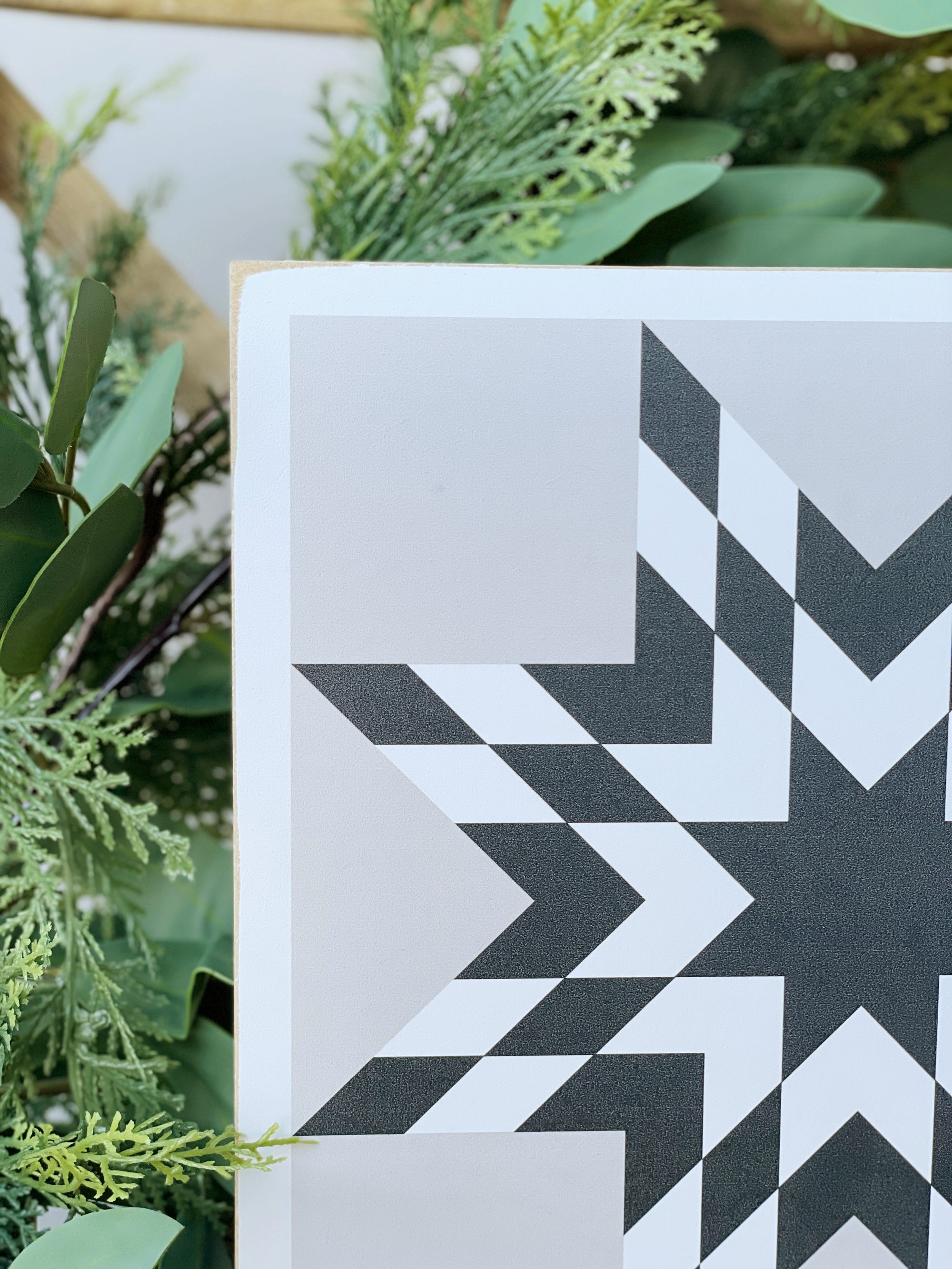 This best-selling barn quilt is handmade, and is truly one-of-a-kind! It is made out of MDF, painted a creamy white, has slightly distressed edges and corners, and has a black and gray NANTUCKET design printed on it.