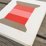 This handmade barn quilt is the perfect block for any quilter or crafter, and is truly one-of-a-kind. It is made out of MDF, painted a creamy white, has slightly distressed edges and corners, and has a pink, red, and gray SPOOL design printed on it.