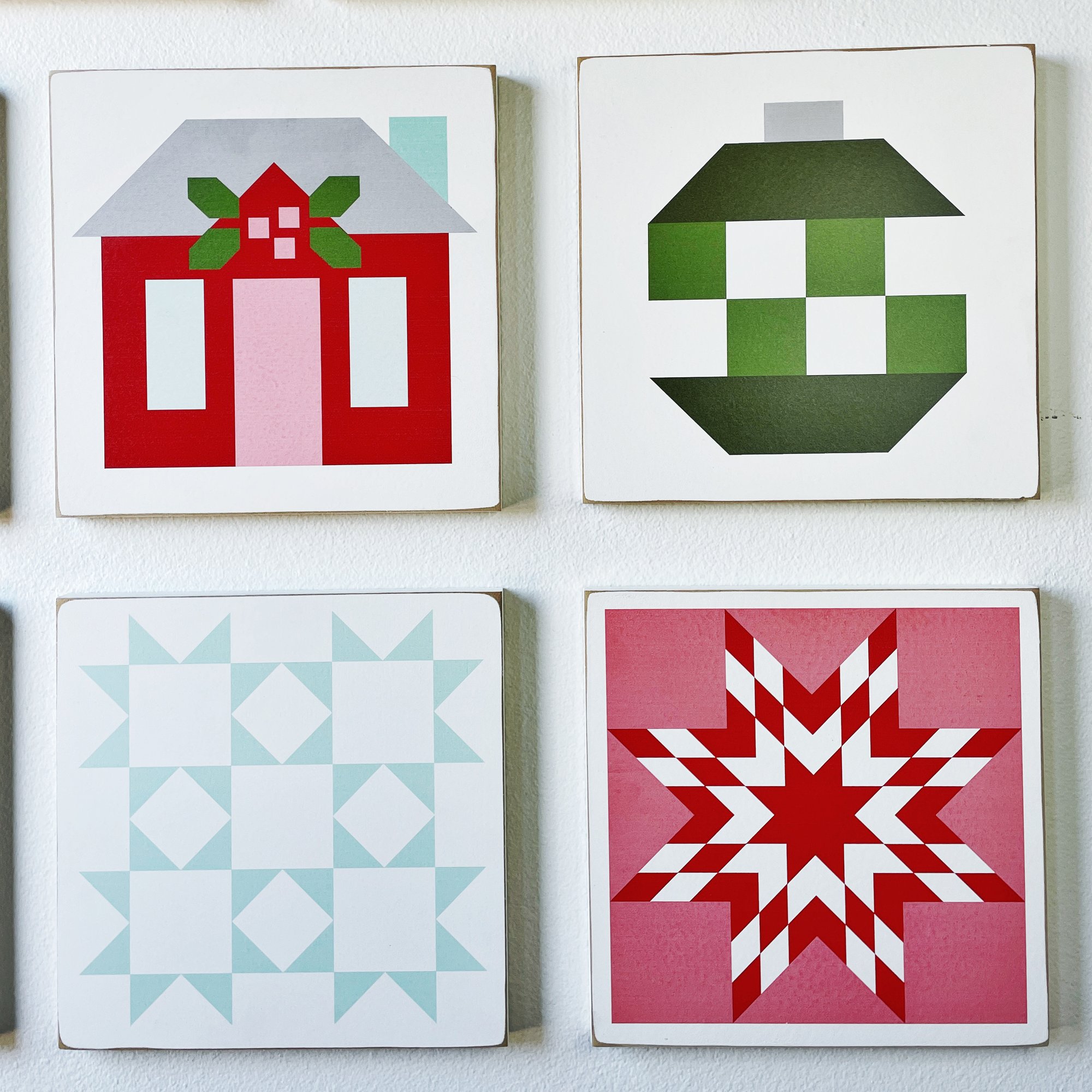 These handmade barn quilts are truly one-of-a-kind! They were designed to coordinate perfectly with Bonnie and Camille's new fabric line Merry Little Christmas. The colors of the quilt blocks are bright and cheerful, while also having a charming vintage look to their design.