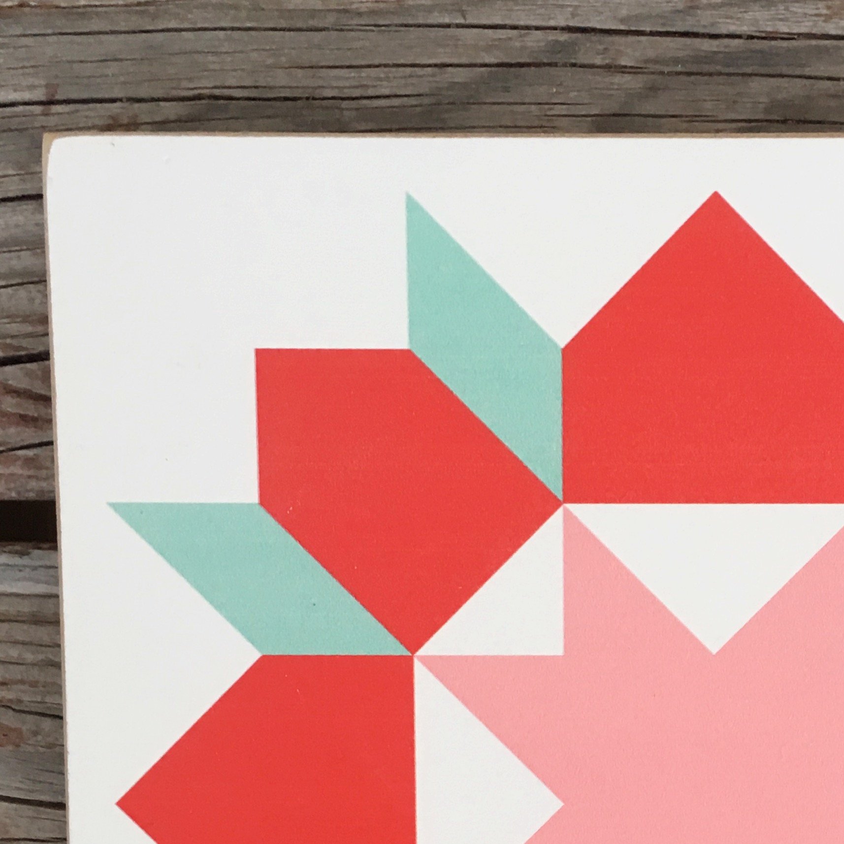 This stunning handmade barn quilt is truly one-of-a-kind, and is one of our best-sellers! It is made out of MDF, painted a creamy white, has slightly distressed edges and corners, and has a pink, red, and mint SWOON design printed on it.